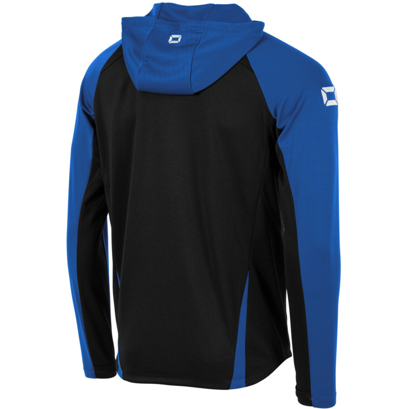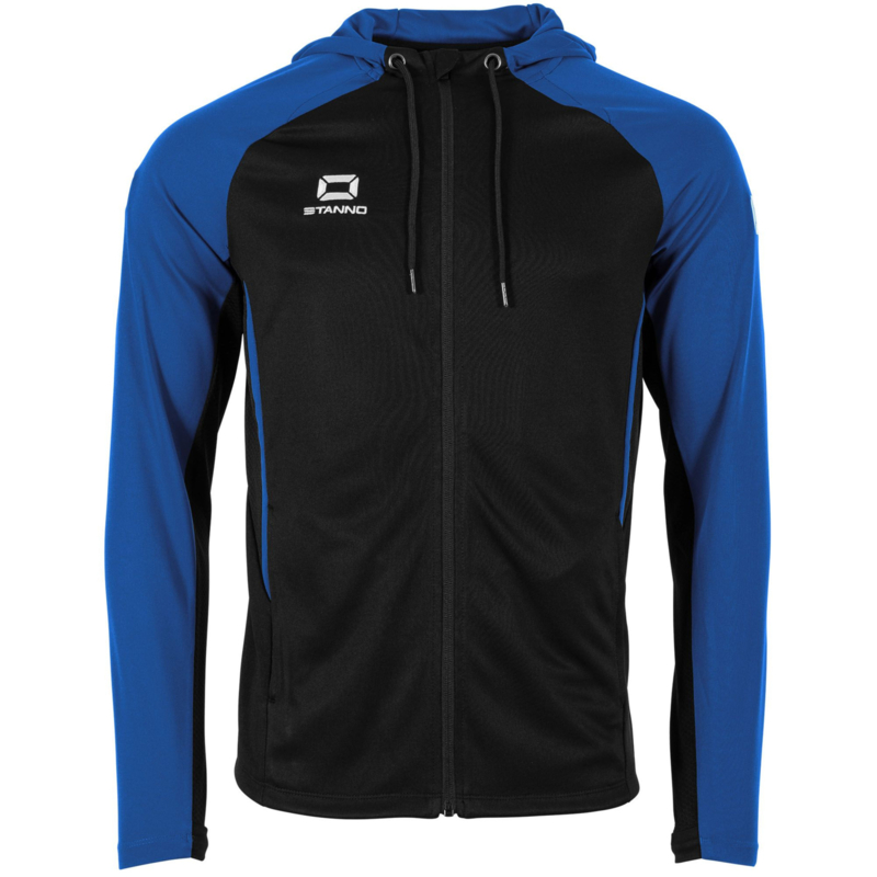 Stanno trainingsvest, Stanno Hoodie Black-Royal, Stadio Hooded Full Zip Top, trainingsvest met rits, sport hoodie met duimgaten, trainingsjack Stanno, sportvest unisex, gerecycled polyester hoodie, SBS rits sportvest, Stanno clubkleding, vereniging, verenigingen